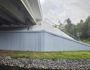 Сопряжение сооружения с насыпями представлено двумя массивными переходными плитами из монолитного бетона, на них же вынесены деформационные швы. Конусы в зоне крайних опор моста отсыпаны из дренирующего грунта и укреплены монолитным бетоном. Для стабильности грунта конусов были устроены подпорные стены.